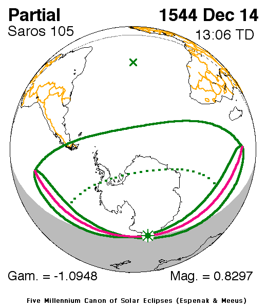 A partial eclipse of the Sun occurred on 14 December, 1544 UT Old Style, with maximum eclipse at 13:03 UT. This was a deep partial eclipse, with 83% of the Sun covered for viewers closest to the center. This provided a significant spectacle for those who saw it.