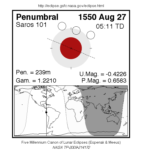A penumbral eclipse of the Moon occurred on 27 August, 1550 UT Old Style, with maximum eclipse at 05:09 UT. This subtle penumbral eclipse may have been visible to a skilled observer at maximum eclipse. 66% of the Moon's disc was partially shaded by the Earth (none of it was in total shadow), which caused a gentle shadow gradient across its disc at maximum; the eclipse as a whole lasted 3 hours and 59 minutes.
