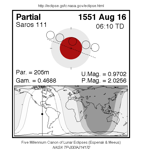 A partial eclipse of the Moon occurred on 16 August, 1551 UT Old Style, with maximum eclipse at 06:07 UT. The Moon was almost covered by the Earth's shadow in a very deep partial eclipse, which lasted 3 hours and 25 minutes. With 97% of the Moon in shadow at maximum eclipse, this was quite a memorable event.
