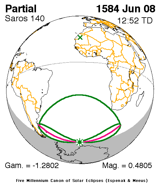 A partial eclipse of the Sun occurred on Friday 8 June, 1584 UT (29 May, 1584 Old Style), with maximum eclipse at 12:50 UT. A small partial eclipse barely darkened the Sun. With just 48% of the Sun covered for viewers closest to the center, this was of limited interest.