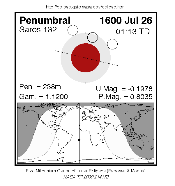 A penumbral eclipse of the Moon occurred on Wednesday 26 July, 1600 UT (16 Jul, 1600 Old Style), with maximum eclipse at 01:11 UT. This subtle penumbral eclipse may have been visible to a skilled observer at maximum eclipse. 80% of the Moon's disc was partially shaded by the Earth (none of it was in total shadow), which caused a gentle shadow gradient across its disc at maximum; the eclipse as a whole lasted 3 hours and 58 minutes.
