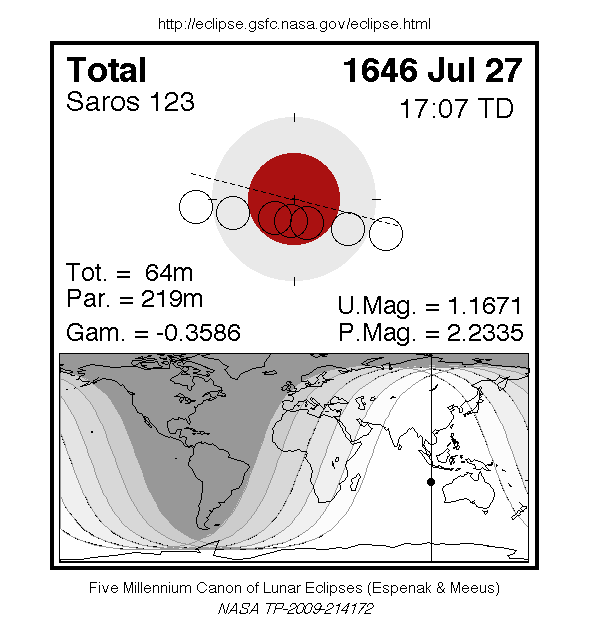 A total eclipse of the Moon occurred on Friday 27 July, 1646 UT (17 Jul, 1646 Old Style), with maximum eclipse at 17:05 UT. A shallow total eclipse saw the Moon in relative darkness for 1 hour and 4 minutes. The Moon was 17% of its diameter into the Earth's umbral shadow, and should have been significantly darkened. The partial eclipse lasted for 3 hours and 39 minutes in total.