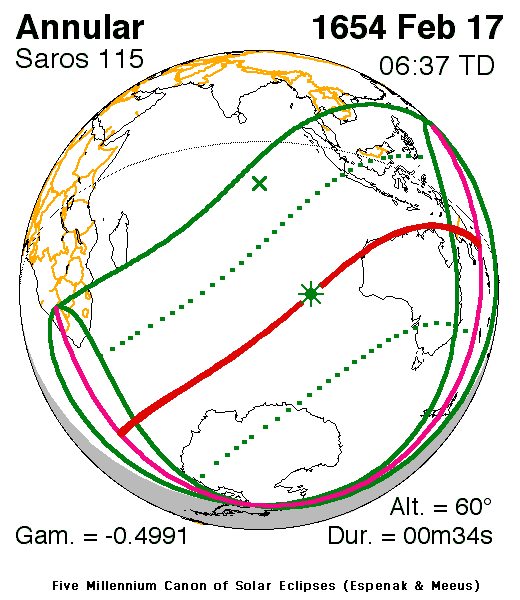 An annular eclipse of the Sun occurred on Tuesday 17 February, 1654 UT (7 Feb, 1654 Old Style), with maximum eclipse at 06:35 UT. A large annular eclipse covered over 99% of the Sun, creating a dramatic spectacle for observers in a narrow path at most 27 km wide; it lasted 34 seconds at the point of maximum eclipse.