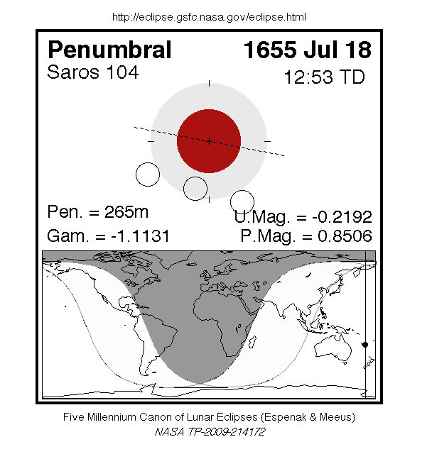 A penumbral eclipse of the Moon occurred on Sunday 18 July, 1655 UT (8 Jul, 1655 Old Style), with maximum eclipse at 12:52 UT. This subtle penumbral eclipse may have been visible to a skilled observer at maximum eclipse. 85% of the Moon's disc was partially shaded by the Earth (none of it was in total shadow), which caused a gentle shadow gradient across its disc at maximum; the eclipse as a whole lasted 4 hours and 25 minutes.