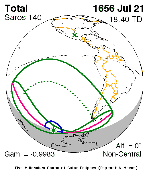 A total eclipse of the Sun occurred on Friday 21 July, 1656 UT (11 Jul, 1656 Old Style), with maximum eclipse at 18:39 UT. A fleeting total eclipse covered only an extremely narrow strip and lasted for just moments at the point of maximum eclipse.