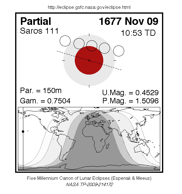 A partial eclipse of the Moon occurred on Tuesday 9 November, 1677 UT (30 Oct, 1677 Old Style), with maximum eclipse at 10:52 UT. The Earth's shadow on the moon was clearly visible in this eclipse, with 45% of the Moon in shadow; the partial eclipse lasted for 2 hours and 30 minutes.