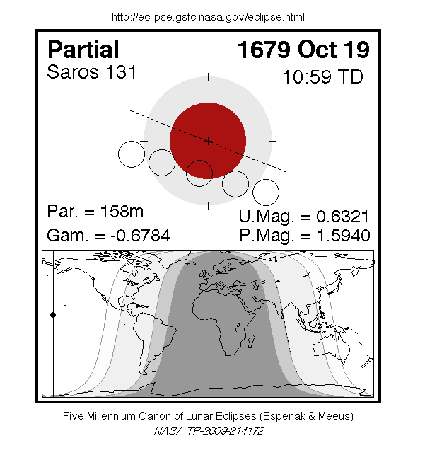A partial eclipse of the Moon occurred on Thursday 19 October, 1679 UT (9 Oct, 1679 Old Style), with maximum eclipse at 10:58 UT. The Moon was strikingly shadowed in this deep partial eclipse which lasted 2 hours and 38 minutes, with 63% of the Moon in darkness at maximum.