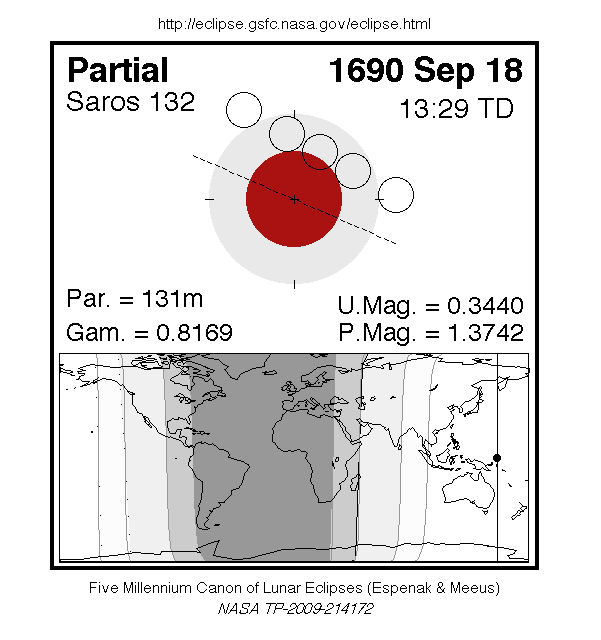 A partial eclipse of the Moon occurred on Monday 18 September, 1690 UT (8 Sep, 1690 Old Style), with maximum eclipse at 13:28 UT. The Earth's shadow on the moon was clearly visible in this eclipse, with 34% of the Moon in shadow; the partial eclipse lasted for 2 hours and 11 minutes.