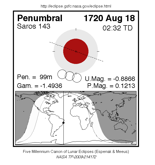 A penumbral eclipse of the Moon occurred on Sunday 18 August, 1720 UT (7 Aug, 1720 Old Style), with maximum eclipse at 02:31 UT. In this extremely marginal eclipse, the Moon barely clipped the edge of the Earth's penumbral shadow. This caused a microscopic darkening of just 12% of the Moon's disc for 1 hour and 39 minutes, which was essentially impossible to see.