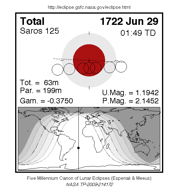 A total eclipse of the Moon occurred on Monday 29 June, 1722 UT (18 Jun, 1722 Old Style), with maximum eclipse at 01:49 UT. A shallow total eclipse saw the Moon in relative darkness for 1 hour and 3 minutes. The Moon was 19% of its diameter into the Earth's umbral shadow, and should have been significantly darkened. The partial eclipse lasted for 3 hours and 19 minutes in total.