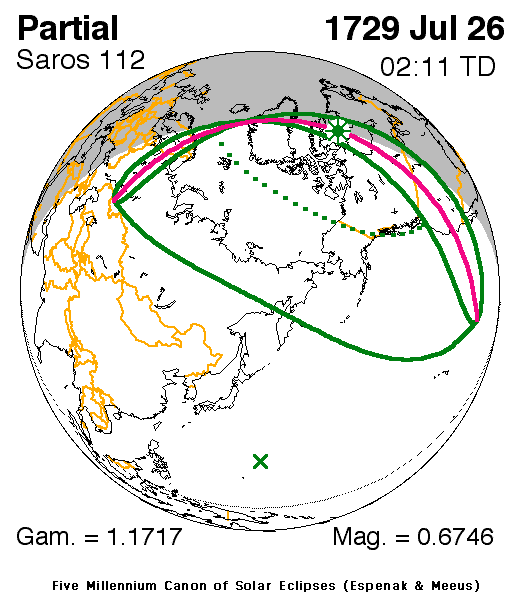 A partial eclipse of the Sun occurred on Tuesday 26 July, 1729 UT (15 Jul, 1729 Old Style), with maximum eclipse at 02:10 UT. A moderate partial eclipse, with 67% of the Sun covered for viewers closest to the center, created an interesting spectacle.
