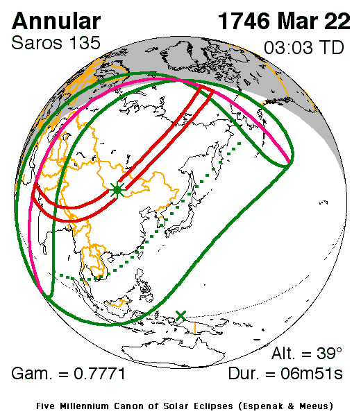 An annular eclipse of the Sun occurred on Tuesday 22 March, 1746 UT (11 Mar, 1746 Old Style), with maximum eclipse at 03:02 UT. A small annular eclipse covered only 93% of the Sun in a very broad path, 419 km wide at maximum, and lasted 6 minutes and 51 seconds.