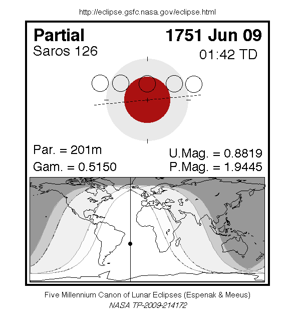 A partial eclipse of the Moon occurred on Wednesday 9 June, 1751 UT (29 May, 1751 Old Style), with maximum eclipse at 01:41 UT. The Moon was strikingly shadowed in this deep partial eclipse which lasted 3 hours and 21 minutes, with 88% of the Moon in darkness at maximum.