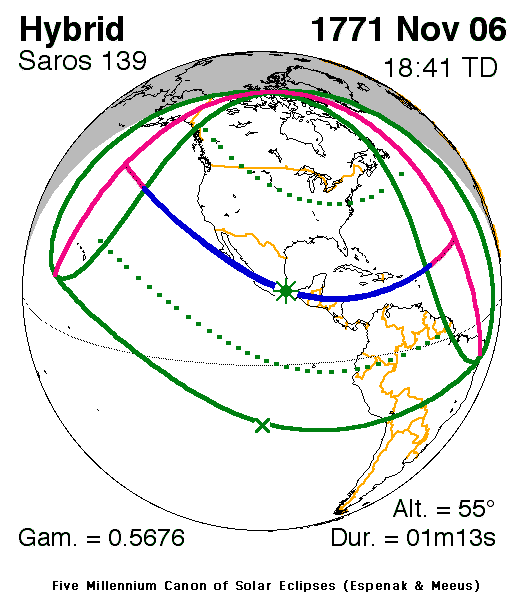 A hybrid eclipse of the Sun occurred on Wednesday 6 November, 1771 UT (26 Oct, 1771 Old Style), with maximum eclipse at 18:40 UT. The Sun was darkened for 1 minute and 13 seconds by a dramatic hybrid eclipse covering a narrow path at most 50 km wide. This was a sight worth seeing.