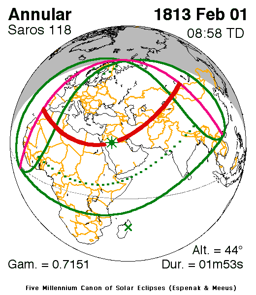 An annular eclipse of the Sun occurred on Monday 1 February, 1813 UT (20 Jan, 1813 Old Style), with maximum eclipse at 08:58 UT. A large annular eclipse covered 98% of the Sun, creating a dramatic spectacle for observers in a path up to 91 km wide; it lasted 1 minute and 53 seconds at the point of maximum eclipse.