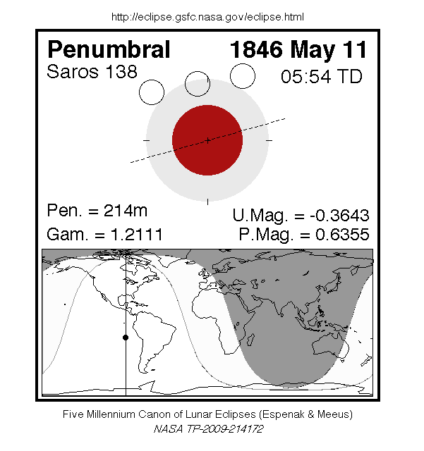A penumbral eclipse of the Moon occurred on Monday 11 May, 1846 UT (29 Apr, 1846 Old Style), with maximum eclipse at 05:53 UT. This subtle penumbral eclipse may have been visible to a skilled observer at maximum eclipse. 64% of the Moon's disc was partially shaded by the Earth (none of it was in total shadow), which caused a gentle shadow gradient across its disc at maximum; the eclipse as a whole lasted 3 hours and 34 minutes.