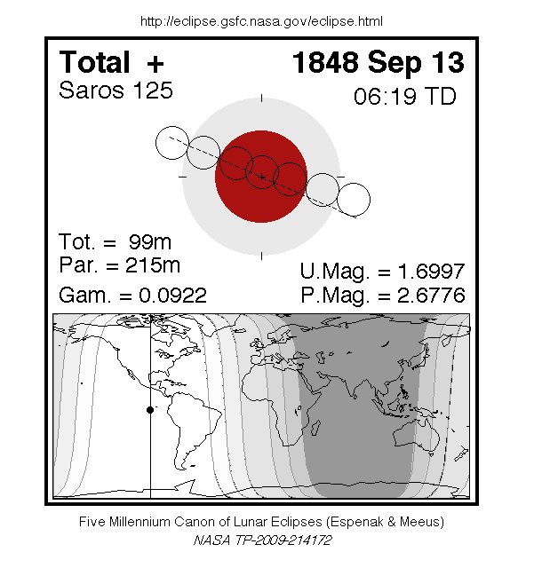A total eclipse of the Moon occurred on Wednesday 13 September, 1848 UT (1 Sep, 1848 Old Style), with maximum eclipse at 06:19 UT. A dramatic total eclipse lasting 1 hour and 39 minutes plunged the full Moon into deep darkness, as it passed right through the centre of the Earth's umbral shadow. While the visual effect of a total eclipse is variable, the Moon may have been stained a deep orange or red colour at maximum eclipse. This was a great spectacle for everyone who saw it. The partial eclipse lasted for 3 hours and 35 minutes in total.