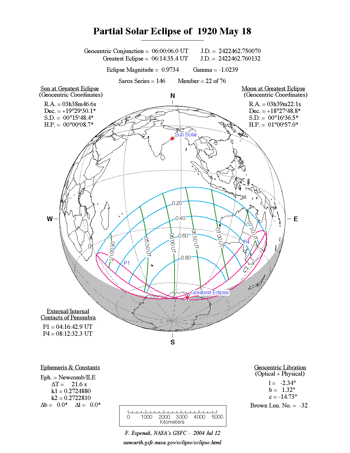 A partial eclipse of the Sun occurred on Tuesday 18 May, 1920 UT (5 May, 1920 Old Style), with maximum eclipse at 06:14 UT. This was a deep partial eclipse, with 97% of the Sun covered for viewers closest to the center. This provided a significant spectacle for those who saw it.