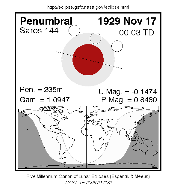 A penumbral eclipse of the Moon occurred on Sunday 17 November, 1929 UT, with maximum eclipse at 00:02 UT. At maximum eclipse, 85% of the Moon's disc was partially shaded by the Earth, which caused a slight shadow gradient across its disc; this subtle effect may have been visible to careful observers. No part of the Moon was in complete shadow. The eclipse lasted 3 hours and 55 minutes overall.