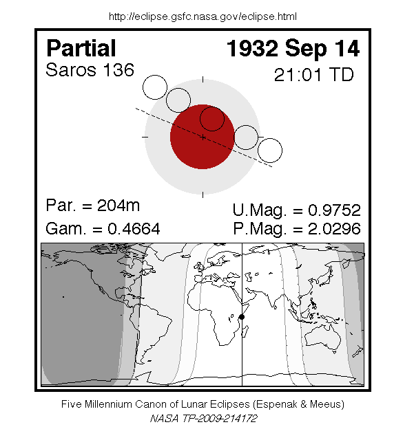 A partial eclipse of the Moon occurred on Wednesday 14 September, 1932 UT, with maximum eclipse at 21:00 UT. The Moon was almost covered by the Earth's shadow in a very deep partial eclipse, which lasted 3 hours and 24 minutes. With 98% of the Moon in shadow at maximum eclipse, this was quite a memorable event.
