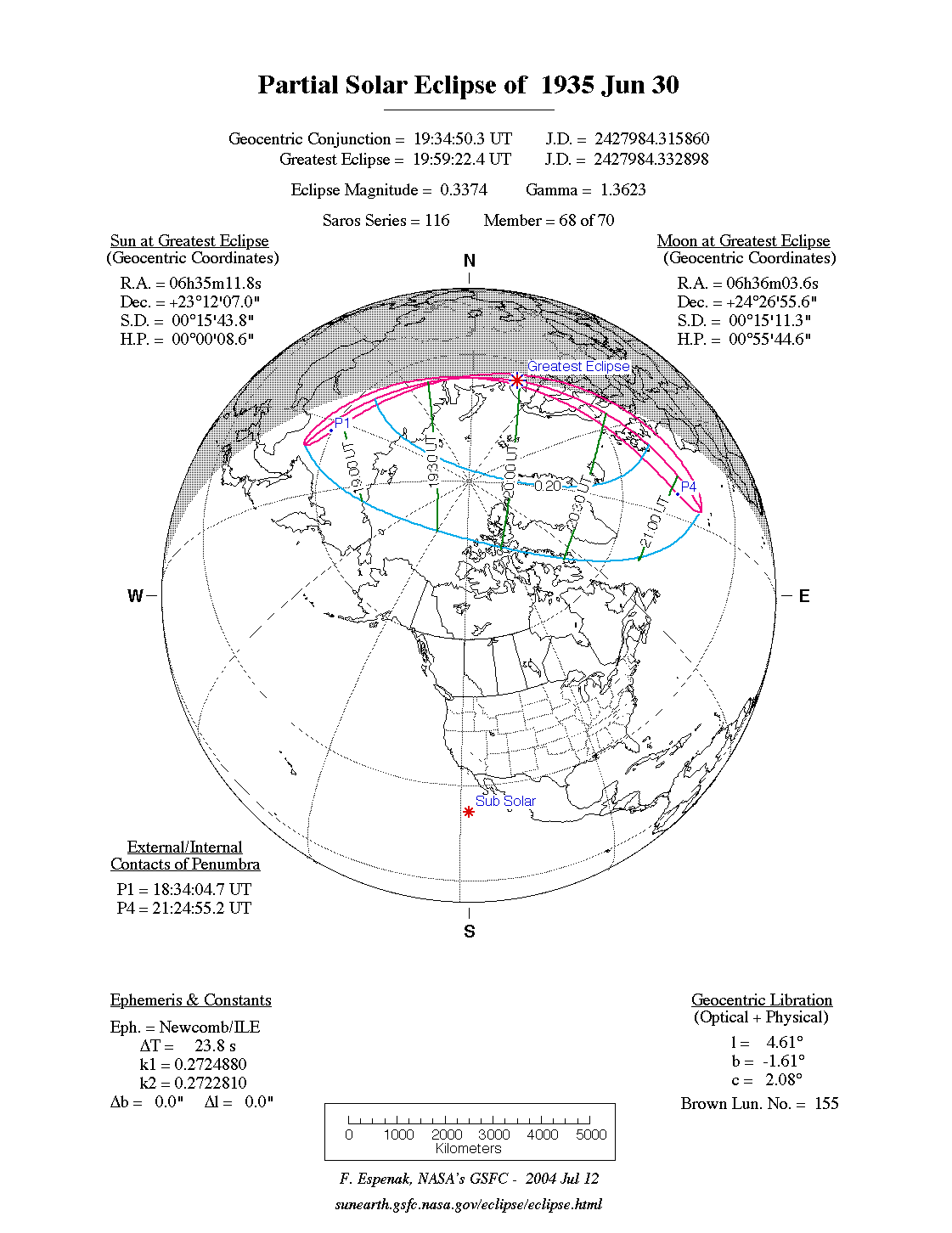 A partial eclipse of the Sun occurred on Sunday 30 June, 1935 UT, with maximum eclipse at 19:59 UT. A small partial eclipse barely darkened the Sun. With just 34% of the Sun covered for viewers closest to the center, this was of limited interest.