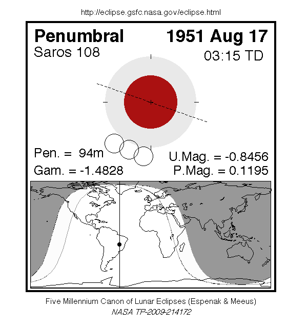 A penumbral eclipse of the Moon occurred on Friday 17 August, 1951 UT, with maximum eclipse at 03:14 UT. In this extremely marginal eclipse, the Moon barely clipped the edge of the Earth's penumbral shadow. This caused a microscopic darkening of just 12% of the Moon's disc for 1 hour and 34 minutes, which was essentially impossible to see.