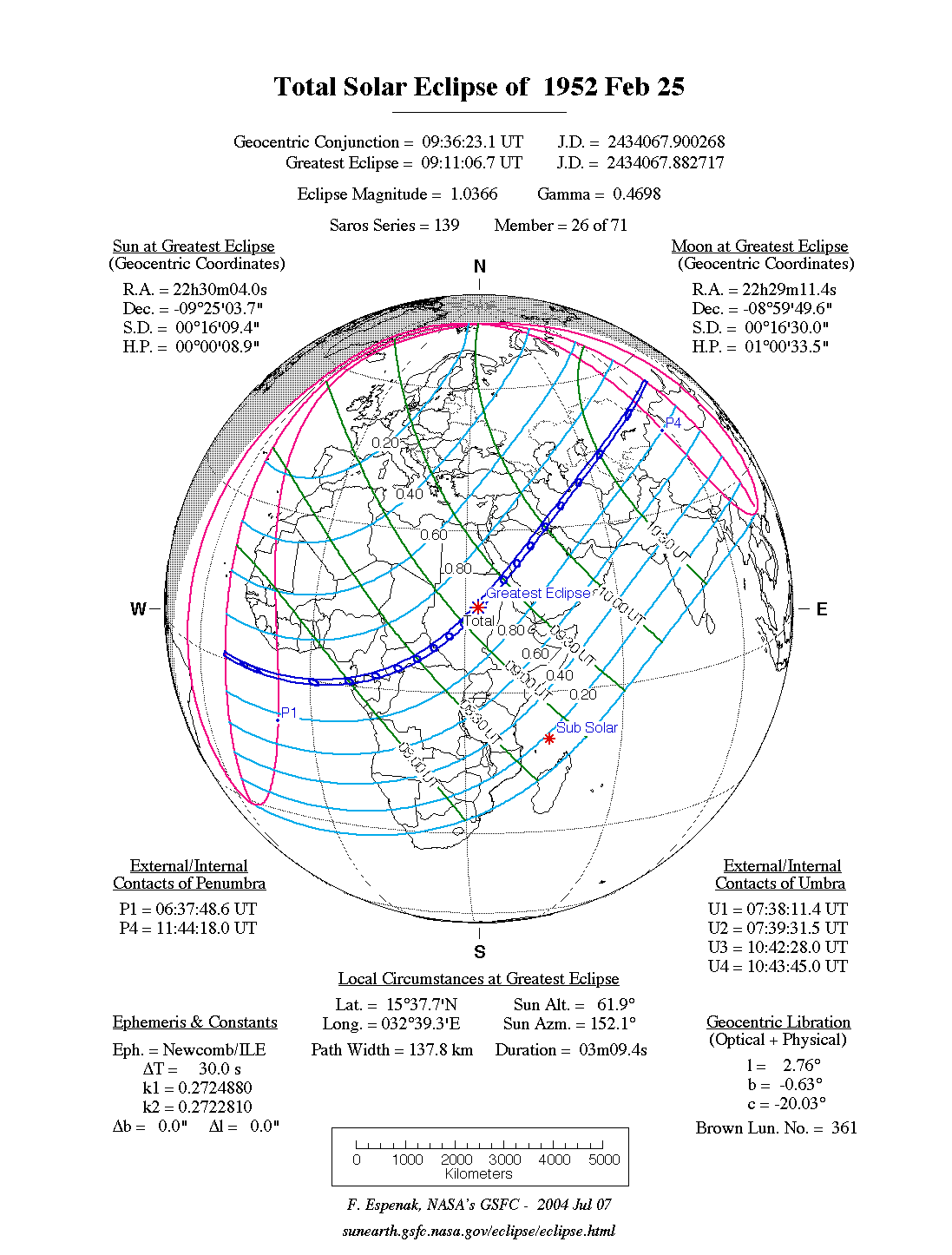 A total eclipse of the Sun occurred on Monday 25 February, 1952 UT, with maximum eclipse at 09:11 UT. A dramatic total eclipse plunged the Sun into darkness for 3 minutes and 9 seconds at maximum, creating an amazing spectacle for observers in a path up to 138 km wide.