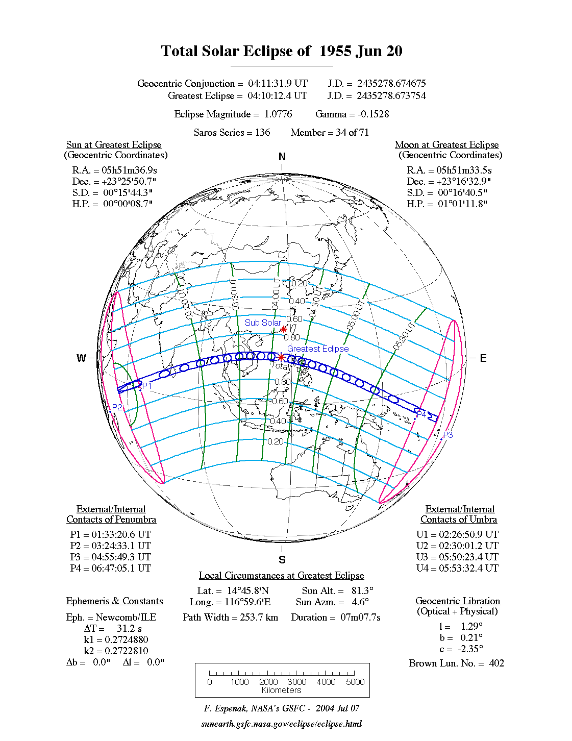 A total eclipse of the Sun occurred on Monday 20 June, 1955 UT, with maximum eclipse at 04:10 UT. A dramatic total eclipse plunged the Sun into darkness for 7 minutes and 8 seconds at maximum, creating an amazing spectacle for observers in a very broad path, 254 km wide at maximum.