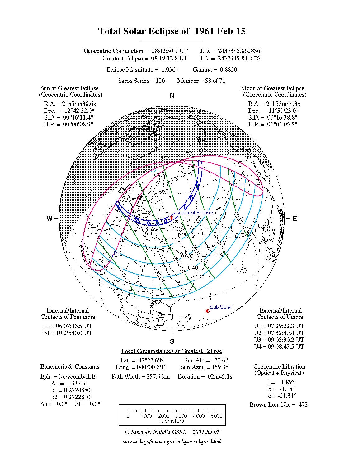 A total eclipse of the Sun occurred on Wednesday 15 February, 1961 UT, with maximum eclipse at 08:19 UT. A dramatic total eclipse plunged the Sun into darkness for 2 minutes and 45 seconds at maximum, creating an amazing spectacle for observers in a very broad path, 258 km wide at maximum.