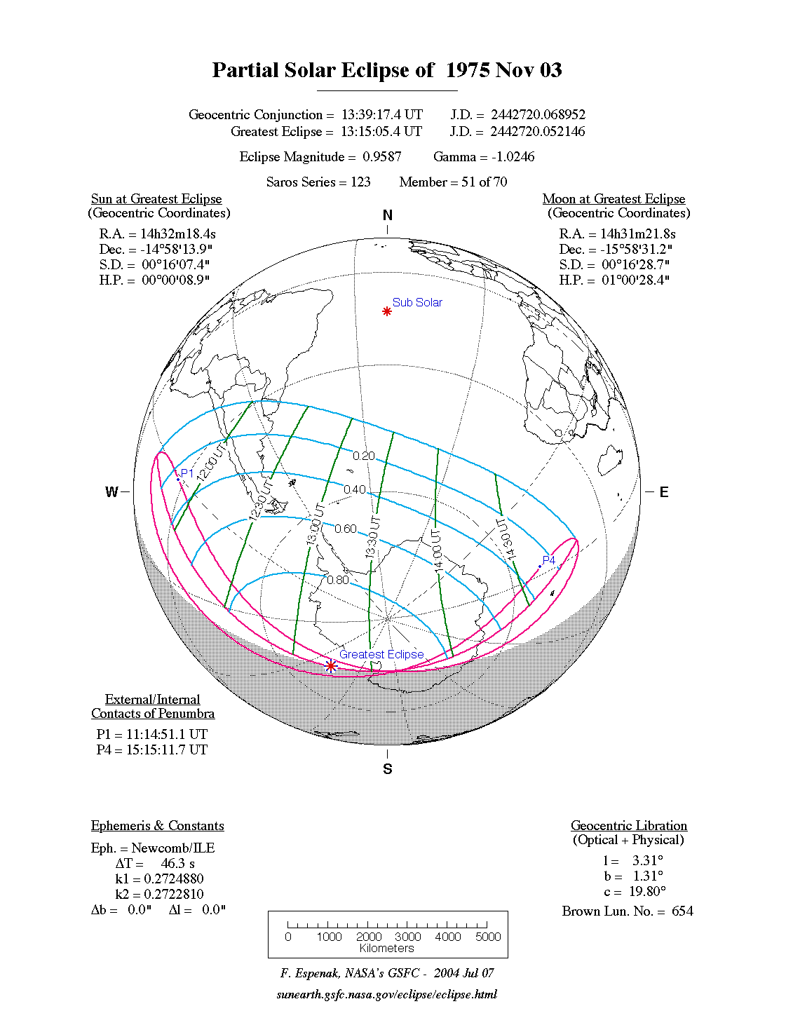 A partial eclipse of the Sun occurred on Monday 3 November, 1975 UT, with maximum eclipse at 13:15 UT. This was a deep partial eclipse, with 96% of the Sun covered for viewers closest to the center. This provided a significant spectacle for those who saw it.