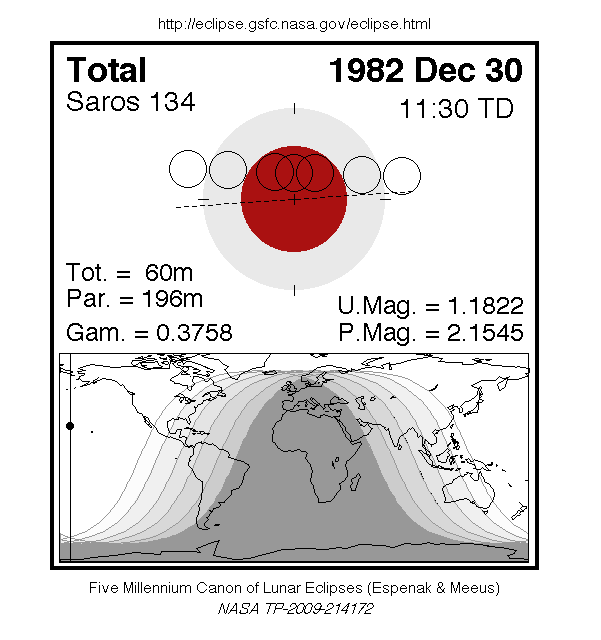 A total eclipse of the Moon occurred on Thursday 30 December, 1982 UT, with maximum eclipse at 11:28 UT. A shallow total eclipse saw the Moon in relative darkness for 1 hour exactly. The Moon was 18% of its diameter into the Earth's umbral shadow, and should have been significantly darkened. The partial eclipse lasted for 3 hours and 16 minutes in total.