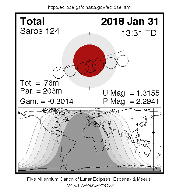 A total eclipse of the Moon occurred on Wednesday 31 January, 2018 UT, lasting from 10:51–16:08 UT. The Moon was plunged into darkness for 1 hour and 16 minutes, in a deep total eclipse which saw the Moon 32% of its diameter inside the Earth's umbral shadow. The visual effect of this depends on the state of the Earth's atmosphere, but the Moon may have been stained a deep red colour for observers from Asia, Australia, and North America. The partial eclipse lasted for 3 hours and 23 minutes in total.
