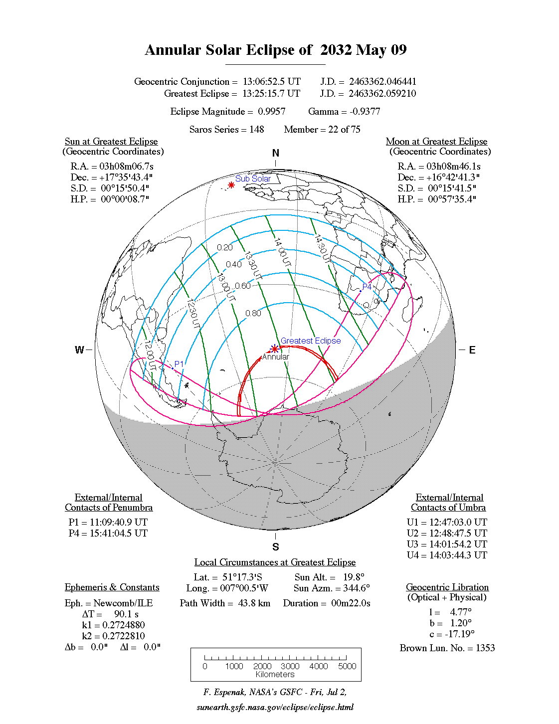 An annular eclipse of the Sun occurs on Sunday 9 May, 2032 UT, lasting from 11:09–15:41 UT. A large annular eclipse will cover over 99% of the Sun, creating a dramatic spectacle for observers in a narrow path at most 44 km wide; it will last just 22 seconds at the point of maximum eclipse. It will be seen from a tiny band in the Southern Ocean. The partial eclipse will be visible in southern South America and Africa.