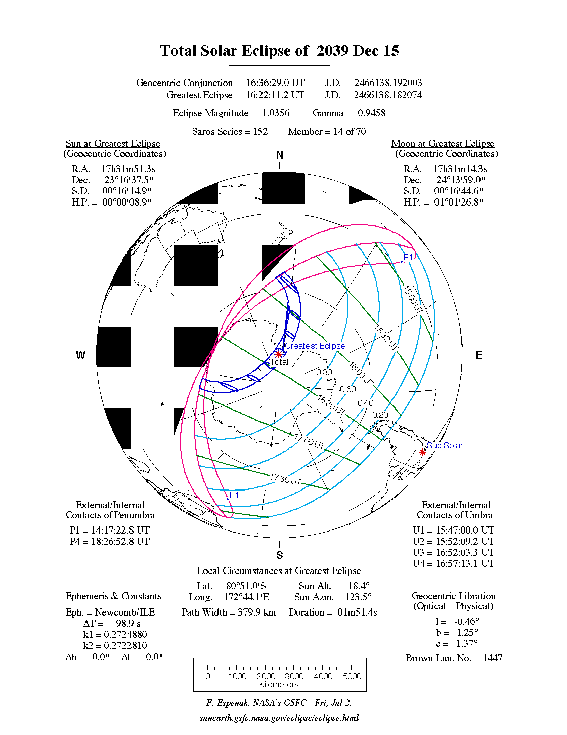 A total eclipse of the Sun occurs on Thursday 15 December, 2039 UT, lasting from 14:17–18:26 UT. The Sun will be darkened for 1 minute and 51 seconds by a dramatic total eclipse covering a very broad path, 380 km wide at maximum. This will be a sight worth seeing, and will be visible from Antarctica. The partial eclipse will be visible in Antarctica and the extreme tip of South America.