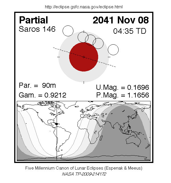 A partial eclipse of the Moon occurs on Friday 8 November, 2041 UT, with maximum eclipse at 04:33 UT. At maximum eclipse, a small bite out of the Moon should be visible. The eclipse will last for 1 hour and 30 minutes, with just 17% of the Moon in shadow at maximum.