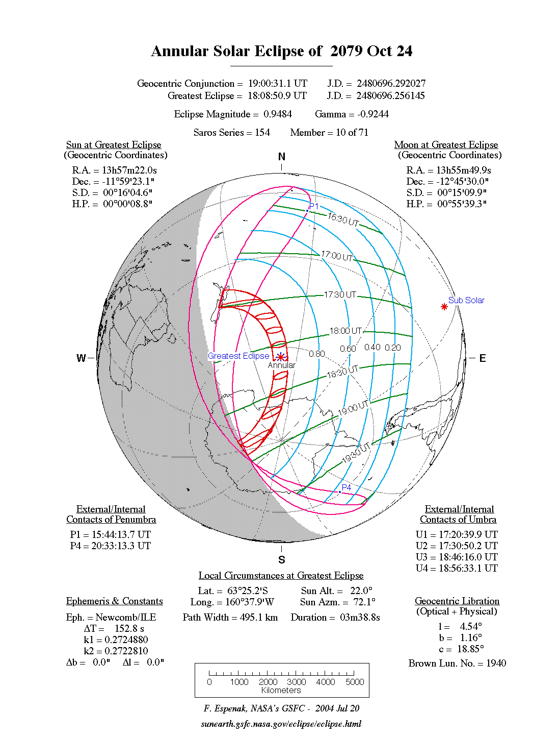 An annular eclipse of the Sun occurs on Tuesday 24 October, 2079 UT, with maximum eclipse at 18:08 UT. The Sun will be 95% covered in a moderate annular eclipse, lasting 3 minutes and 39 seconds and covering a very broad path, 495 km wide at maximum.