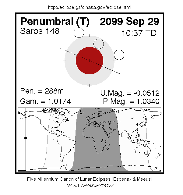 A penumbral eclipse of the Moon occurs on Tuesday 29 September, 2099 UT, with maximum eclipse at 10:33 UT. In a rare total penumbral eclipse, the entire Moon will be partially shaded by the Earth (though none of it will be in complete shadow), and the shading across the Moon should be quite visible at maximum eclipse. The penumbral phase will last for 4 hours and 48 minutes in all, though for most of it, the eclipse will be extremely difficult or impossible to see.