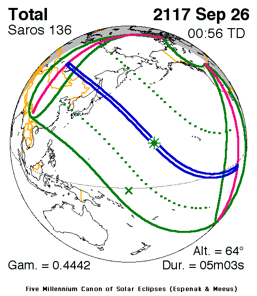 A total eclipse of the Sun occurs on Sunday 26 September, 2117 UT, with maximum eclipse at 00:51 UT. A dramatic total eclipse will plunge the Sun into darkness for 5 minutes and 3 seconds at maximum, creating an amazing spectacle for observers in a broad path up to 233 km wide.