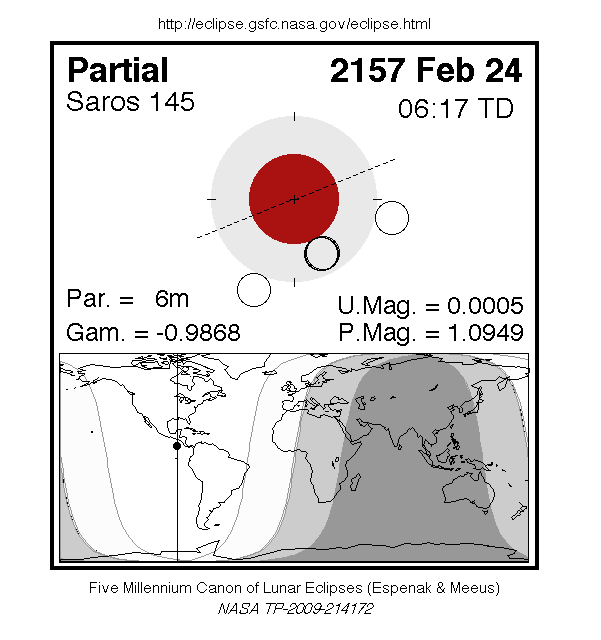 A partial eclipse of the Moon occurs on Thursday 24 February, 2157 UT, with maximum eclipse at 06:10 UT. While technically a partial eclipse, the Moon barely clips the Earth's umbral shadow, which may be very difficult to observe in practice; though a shading across the moon from the Earth's penumbral shadow should be visible at maximum eclipse. The partial eclipse will last for 5 minutes and 36 seconds.