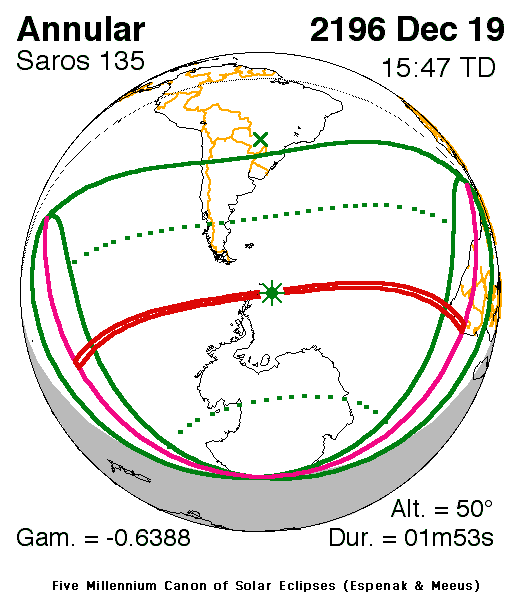 An annular eclipse of the Sun occurs on Monday 19 December, 2196 UT, with maximum eclipse at 15:39 UT. A large annular eclipse will cover 98% of the Sun, creating a dramatic spectacle for observers in a path up to 111 km wide; it will last 1 minute and 53 seconds at the point of maximum eclipse.