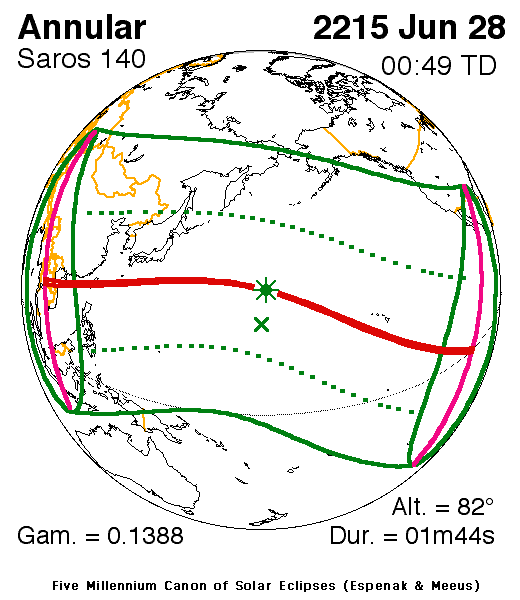 An annular eclipse of the Sun occurs on Wednesday 28 June, 2215 UT, with maximum eclipse at 00:40 UT. A large annular eclipse will cover 98% of the Sun, creating a dramatic spectacle for observers in a narrow path at most 58 km wide; it will last 1 minute and 44 seconds at the point of maximum eclipse.