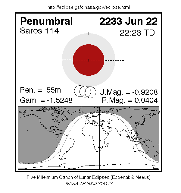 A penumbral eclipse of the Moon occurs on Saturday 22 June, 2233 UT, with maximum eclipse at 22:13 UT. In this extremely marginal eclipse, the Moon barely clips the edge of the Earth's penumbral shadow. This will cause a microscopic darkening of just 4% of the Moon's disc for 54 minutes and 48 seconds, which will be essentially impossible to see.