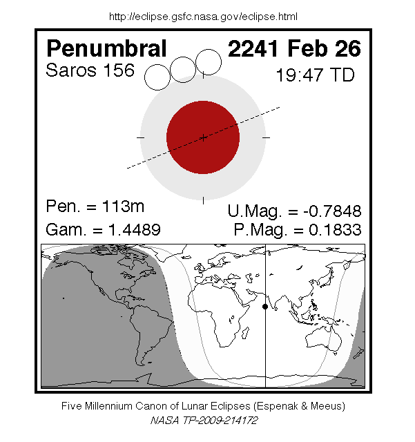 A penumbral eclipse of the Moon occurs on Friday 26 February, 2241 UT, with maximum eclipse at 19:37 UT. In this extremely marginal eclipse, the Moon barely clips the edge of the Earth's penumbral shadow. This will cause a microscopic darkening of just 18% of the Moon's disc for 1 hour and 53 minutes, which will be essentially impossible to see.
