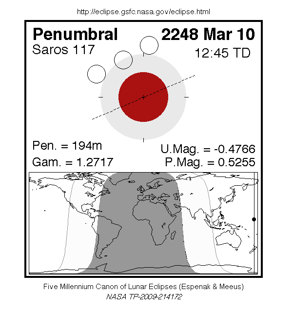 A penumbral eclipse of the Moon occurs on Friday 10 March, 2248 UT, with maximum eclipse at 12:35 UT. This very subtle penumbral eclipse will be essentially invisible to the naked eye; though it will last 3 hours and 14 minutes, just 53% of the Moon's disc will be in partial shadow (with no part of it in complete shadow).