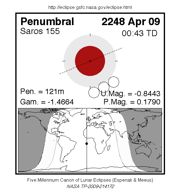 A penumbral eclipse of the Moon occurs on Sunday 9 April, 2248 UT, with maximum eclipse at 00:33 UT. In this extremely marginal eclipse, the Moon barely clips the edge of the Earth's penumbral shadow. This will cause a microscopic darkening of just 18% of the Moon's disc for 2 hours and 1 minute, which will be essentially impossible to see.