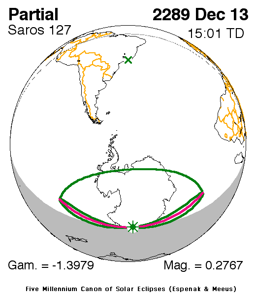 A partial eclipse of the Sun occurs on Friday 13 December, 2289 UT, with maximum eclipse at 14:49 UT. A small partial eclipse will barely darken the Sun. With just 28% of the Sun covered for viewers closest to the center, this will be of limited interest.
