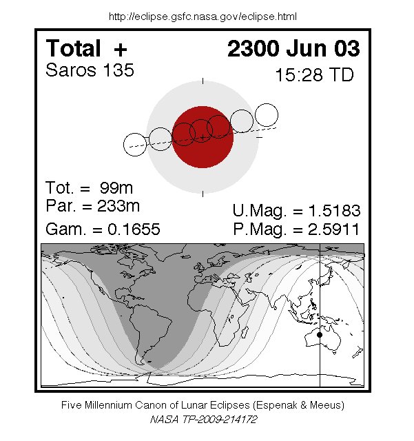 A total eclipse of the Moon occurs on Sunday 3 June, 2300 UT, with maximum eclipse at 15:16 UT. The Moon will be plunged into darkness for 1 hour and 39 minutes, in a deep total eclipse which will see the Moon 52% of its diameter inside the Earth's umbral shadow. The visual effect of this depends on the state of the Earth's atmosphere, but the Moon may be stained a deep red colour. The partial eclipse will last for 3 hours and 53 minutes in total.