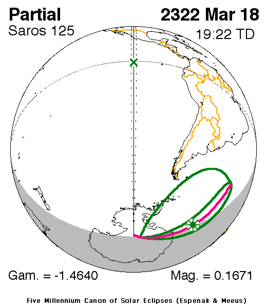 A partial eclipse of the Sun occurs on Saturday 18 March, 2322 UT, with maximum eclipse at 19:08 UT. With only 17% of the Sun covered at maximum eclipse, this will be a very marginal eclipse at best, and rather uninteresting.