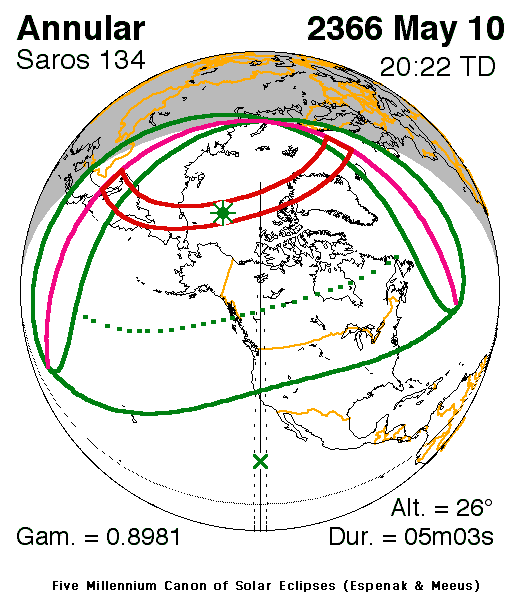 An annular eclipse of the Sun occurs on Tuesday 10 May, 2366 UT, with maximum eclipse at 20:06 UT. A small annular eclipse will cover only 93% of the Sun in a very broad path, 583 km wide at maximum, and will last 5 minutes and 3 seconds.