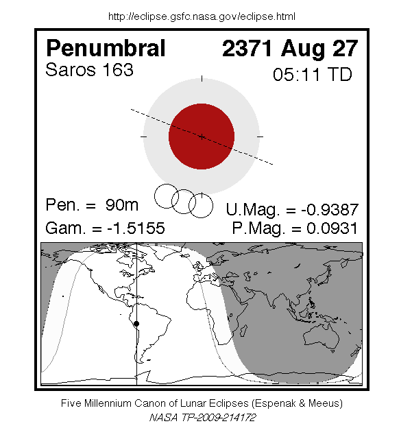 A penumbral eclipse of the Moon occurs on Friday 27 August, 2371 UT, with maximum eclipse at 04:54 UT. In this extremely marginal eclipse, the Moon barely clips the edge of the Earth's penumbral shadow. This will cause a microscopic darkening of just 9% of the Moon's disc for 1 hour and 30 minutes, which will be essentially impossible to see.